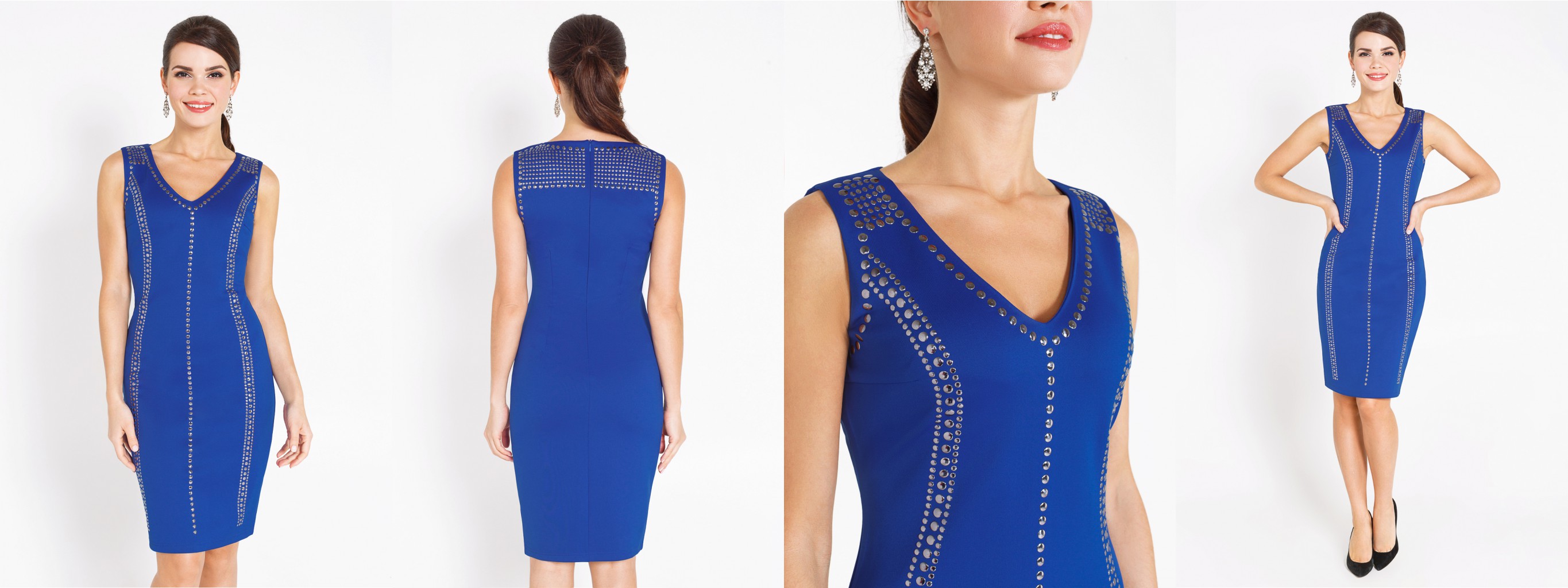 Модель облегающего кроя с V-образным вырезом на груди и застежкой-молнией сзади.
