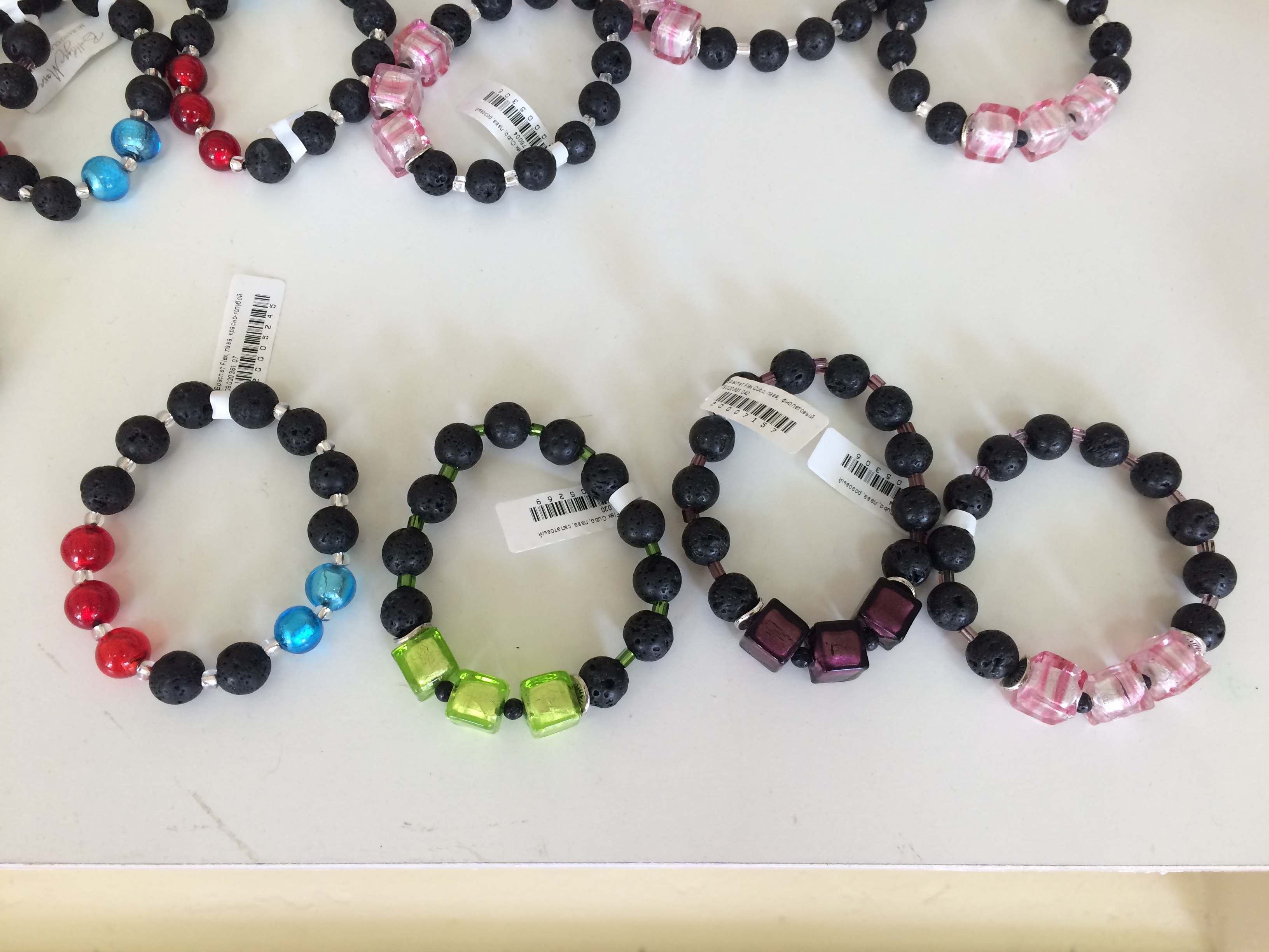 Стильные браслеты на прочной эластичной основе с бусинами круглой и кубической формы из цветного мура*нского стекла на сусальном золоте и серебре, дополненными круглыми бусинами из черной вулканической лавы или белого коралла.