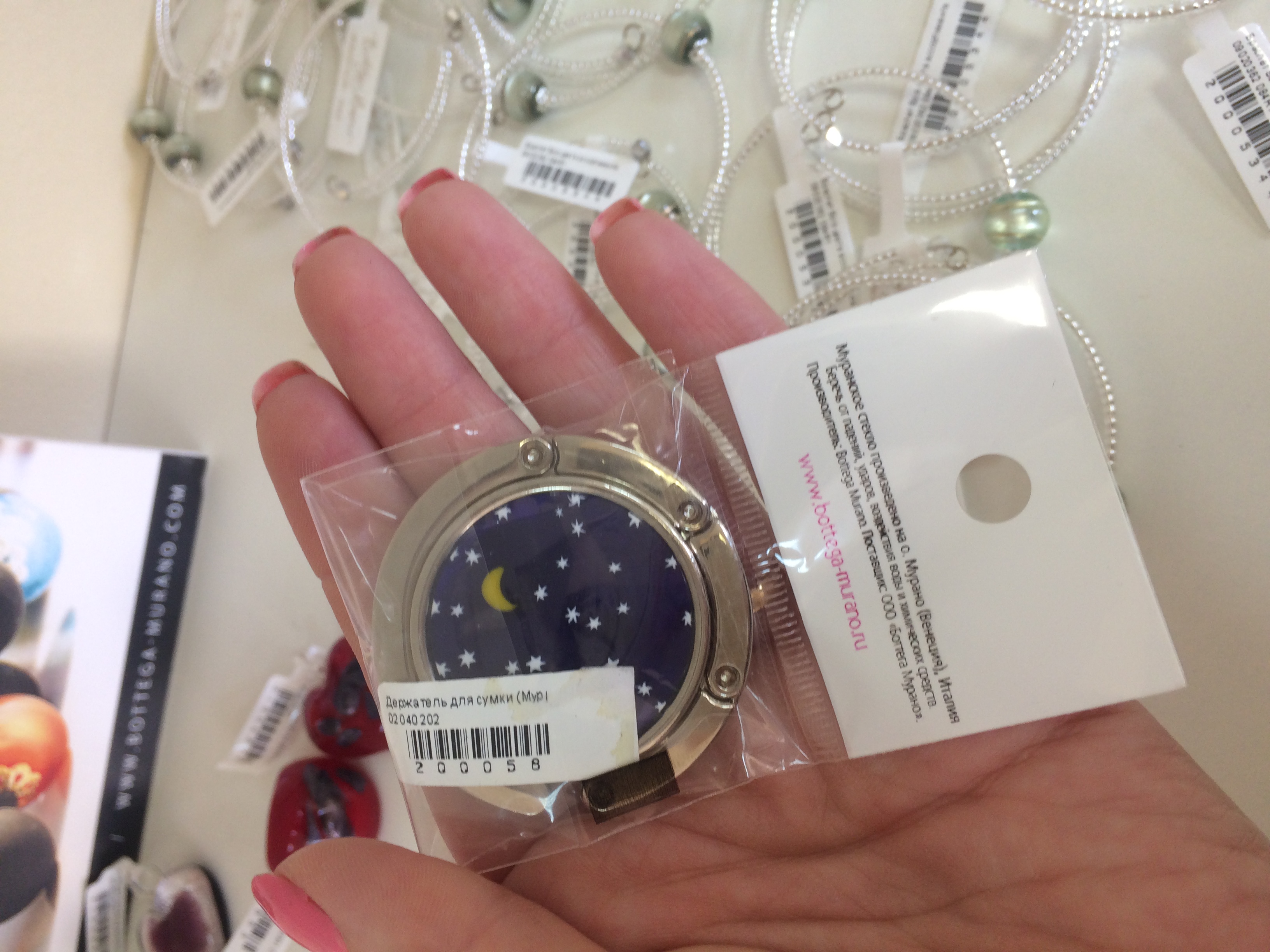 Металлический держатель для сумки линии Bottega Murano, поверхность держателя выполнена из муранского стекла с синими, белыми и розовыми мурринами.
