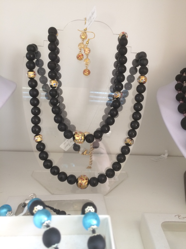 Бусины из муран**ского стекла с сусальным золотом и разноцветными вкраплениями в сочетании с черными бусинами синтетического агата.