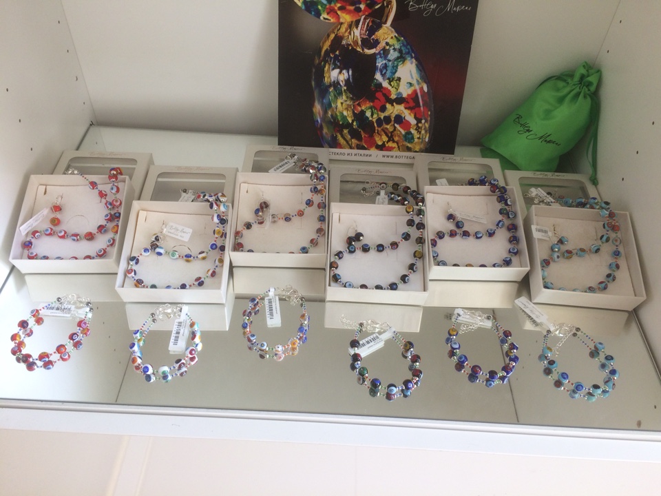 Небольшие бусины из муран*ского стекла ручной работы с мур**ринами. Между бусин цветной венецианский бисер.