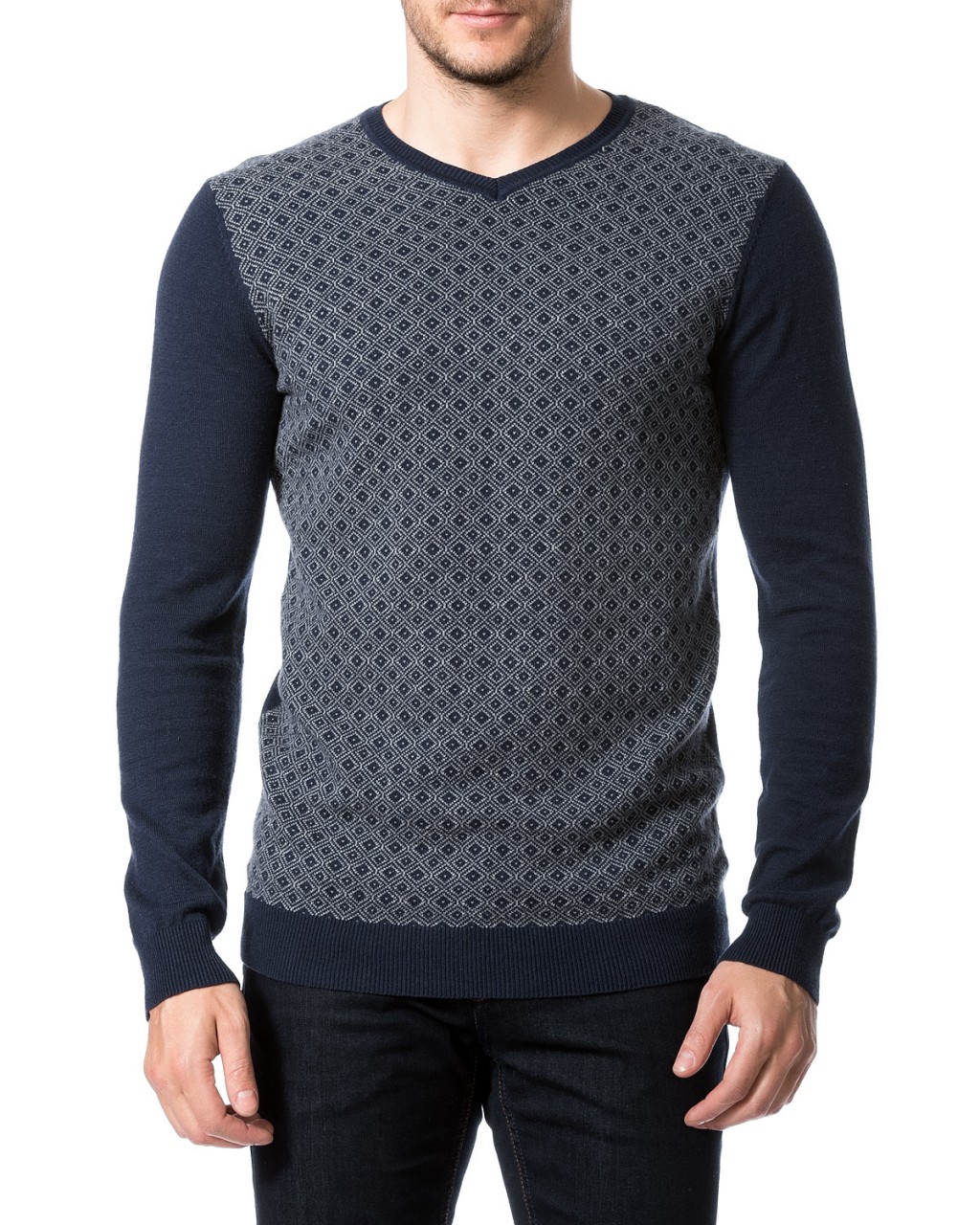 Джемпер мужской с длинным рукавом и V-образным вырезом. Полочка выполнена в 2-х цветном жаккардовом переплетении.