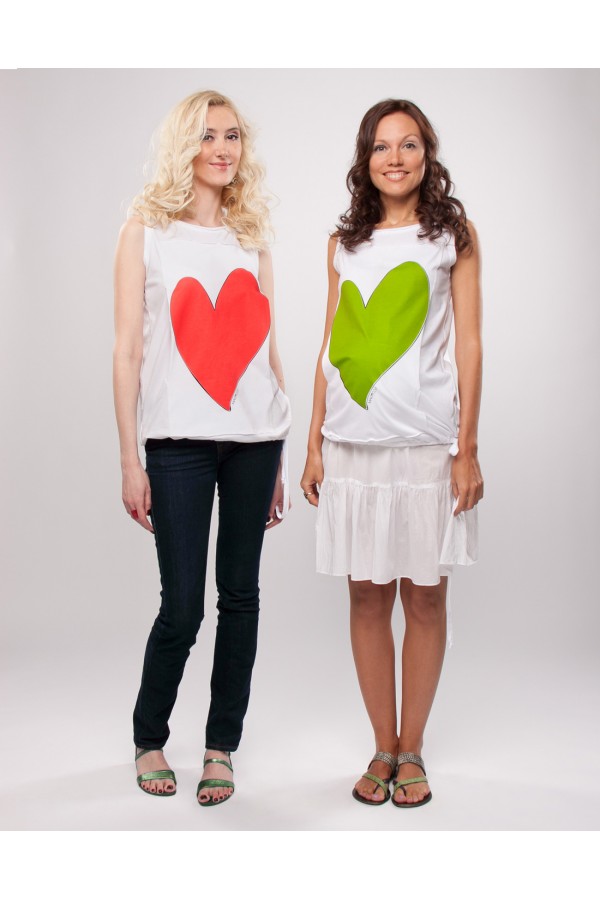 Цвета и размеры: белый/с красным сердцем (размеры S, M, L), белый/с зеленым сердцем (размеры: XL).